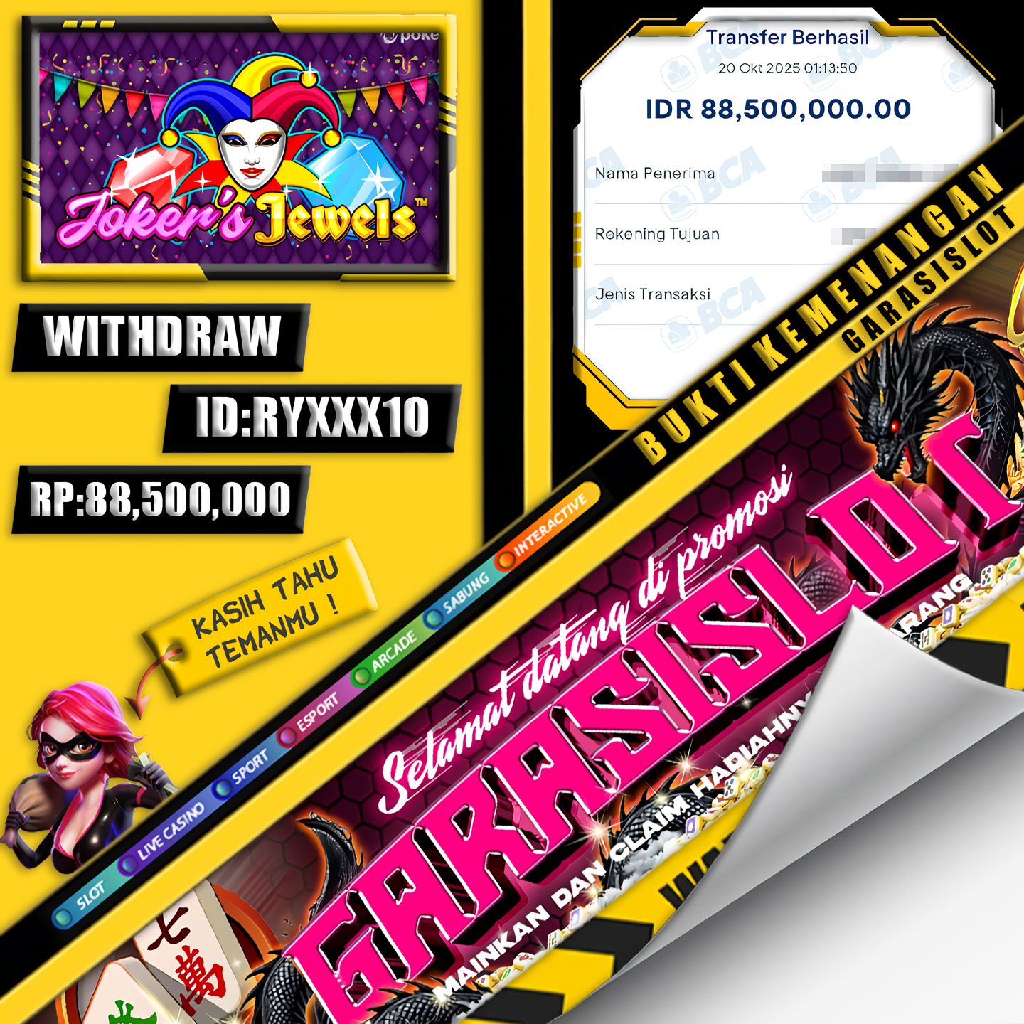 Kabar gembira datang dari GARASISLOT! Kali ini, kemenangan besar berhasil diraih dari game slot klasik penuh warna — Joker’s Jewels. Dengan tema badut sirkus dan permata berkilau, permainan ini membuktikan bahwa keberuntungan bisa datang kapan saja, bahkan dari satu putaran sederhana yang berubah menjadi kemenangan sensasional!