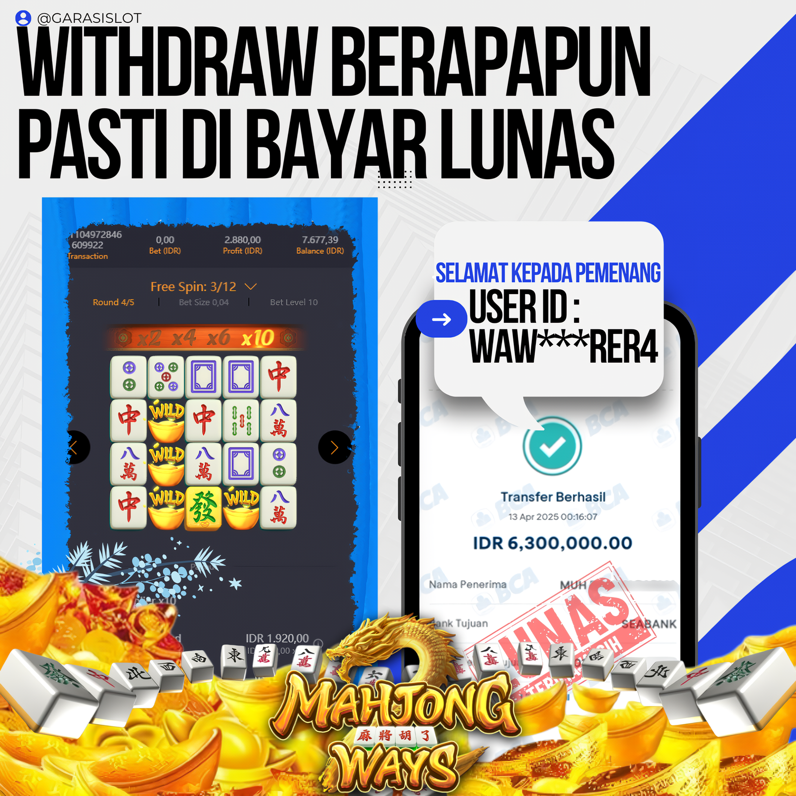 Selamat atas kemenangan user ID: WAW***RER4 yang telah berhasil mendapatkan jackpot di permainan Pg soft dengan kemenangan besar RP 6.300.000,-. Setelah berhasil isi form withdraw team GARASISLOT langsung proses hanya 2-3 menit untuk transfer kemenangan team kita selalu yang terbaik.
