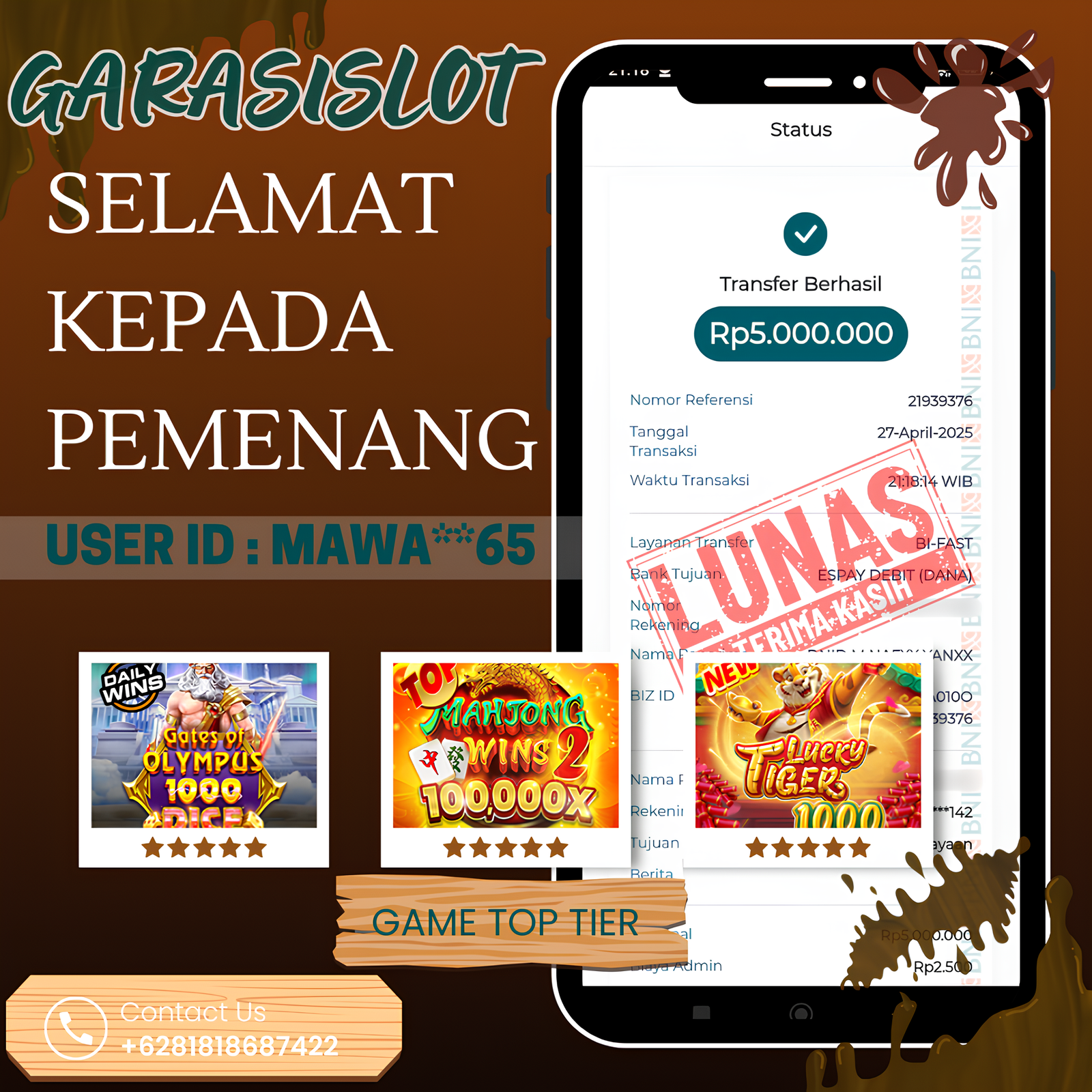 Selamat atas kemenangan user ID: mawa**65 yang telah berhasil mendapatkan jackpot di permainan Pg soft dengan kemenangan besar RP 5.000.000,-. Setelah berhasil isi form withdraw team GARASISLOT langsung proses hanya 2-3 menit untuk transfer kemenangan team kita selalu yang terbaik.