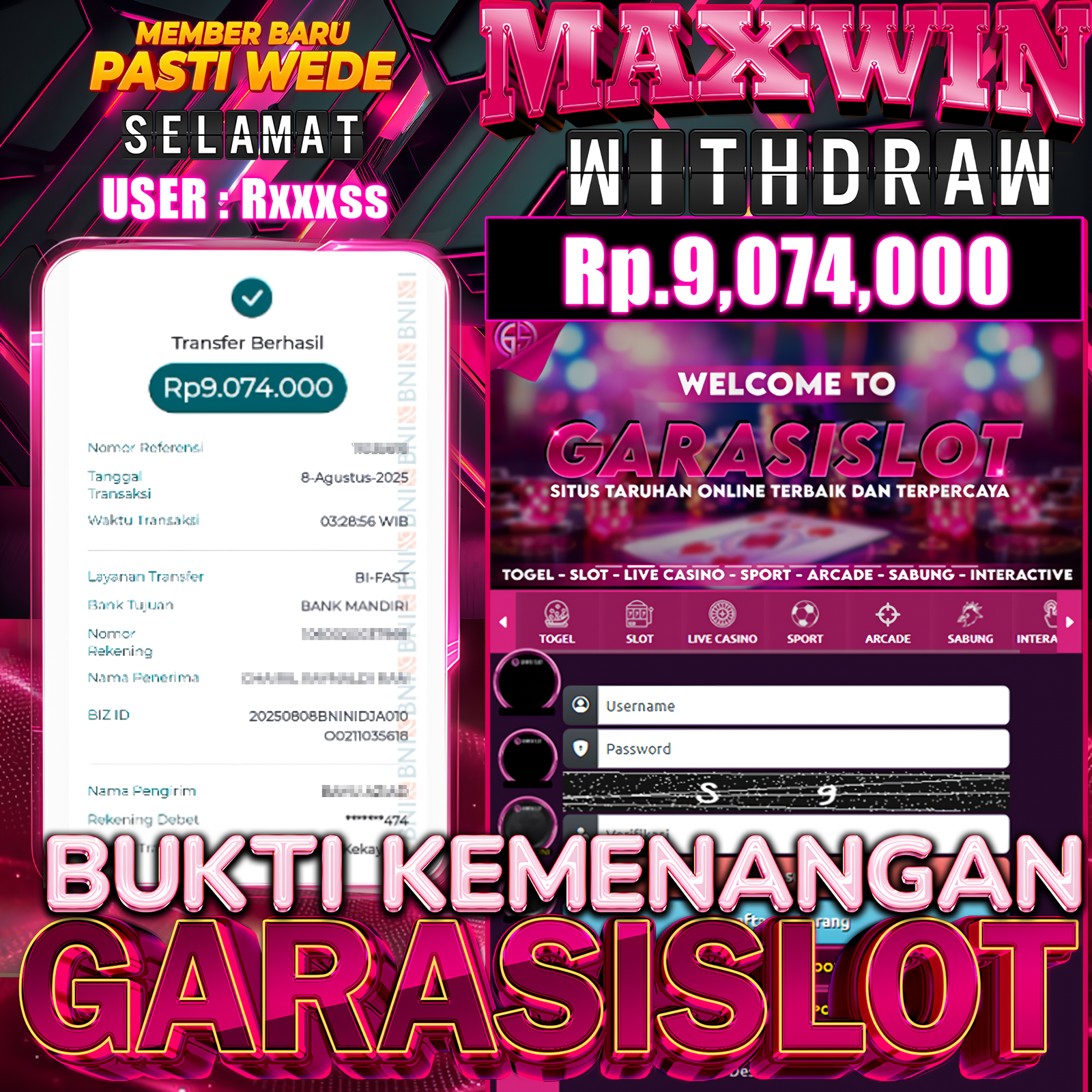 Selamat Kepada Id : RXXXSS Atas Withdraw Rp. 9.074.000 Juta Hari ini. Ditunggu Withdraw Selanjutnya dan ajak juga teman temannya bergabung diĀ GARASISLOT
