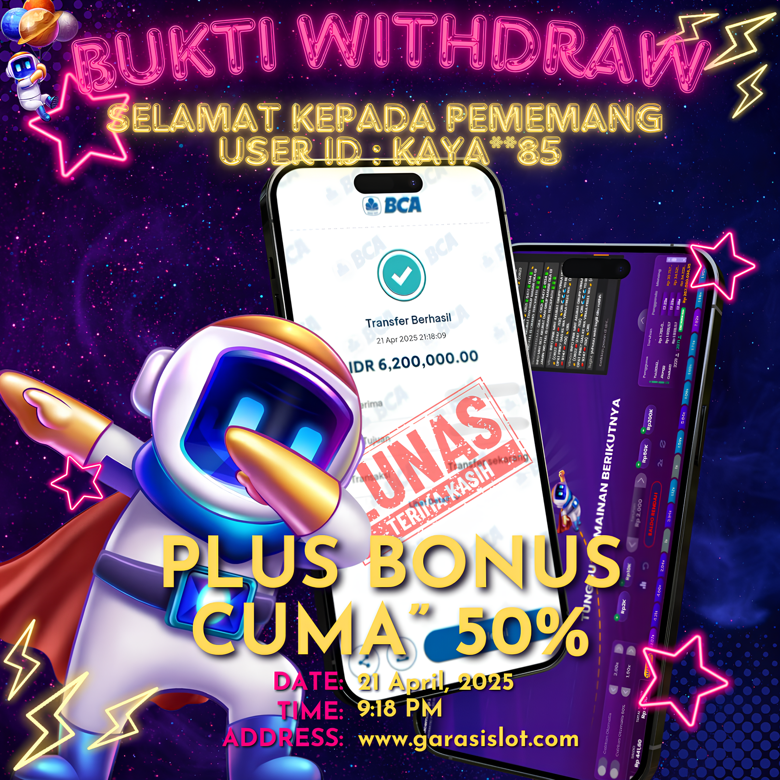 Selamat atas kemenangan user ID: KAYA**85 yang telah berhasil mendapatkan jackpot di permainan SPACEMAN dengan kemenangan besar RP 6.200.000,-. Setelah berhasil isi form withdraw team GARASISLOT langsung proses hanya 2-3 menit untuk transfer kemenangan team kita selalu yang terbaik.