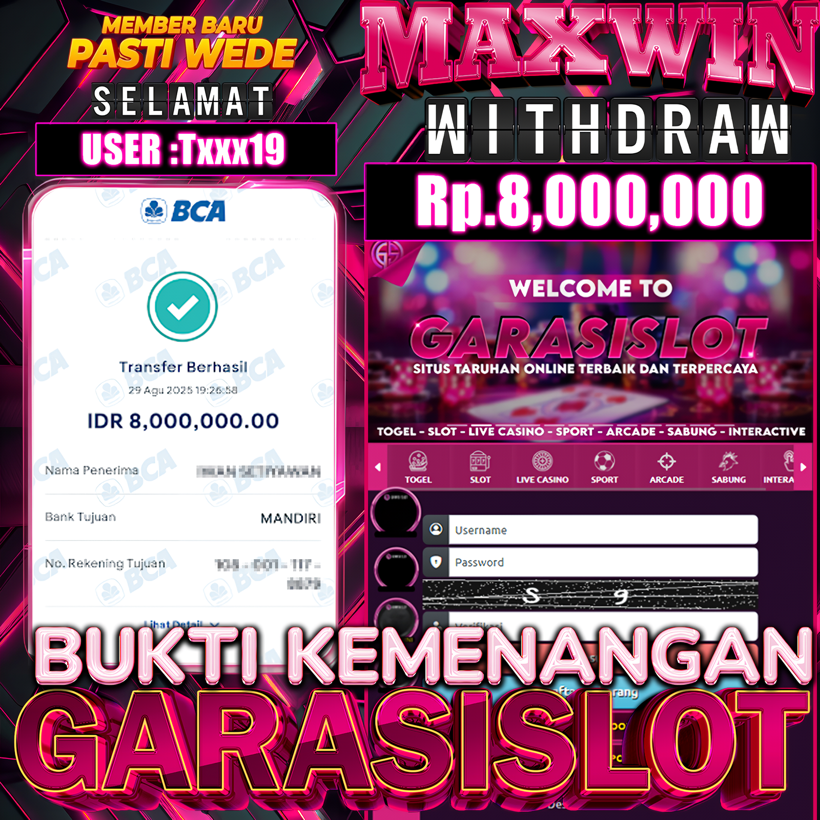 Selamat Kepada Id : TXXX19 Atas Withdraw Rp. 8.000.000 Juta Hari ini. Ditunggu Withdraw Selanjutnya dan ajak juga teman temannya bergabung di GARASISLOT