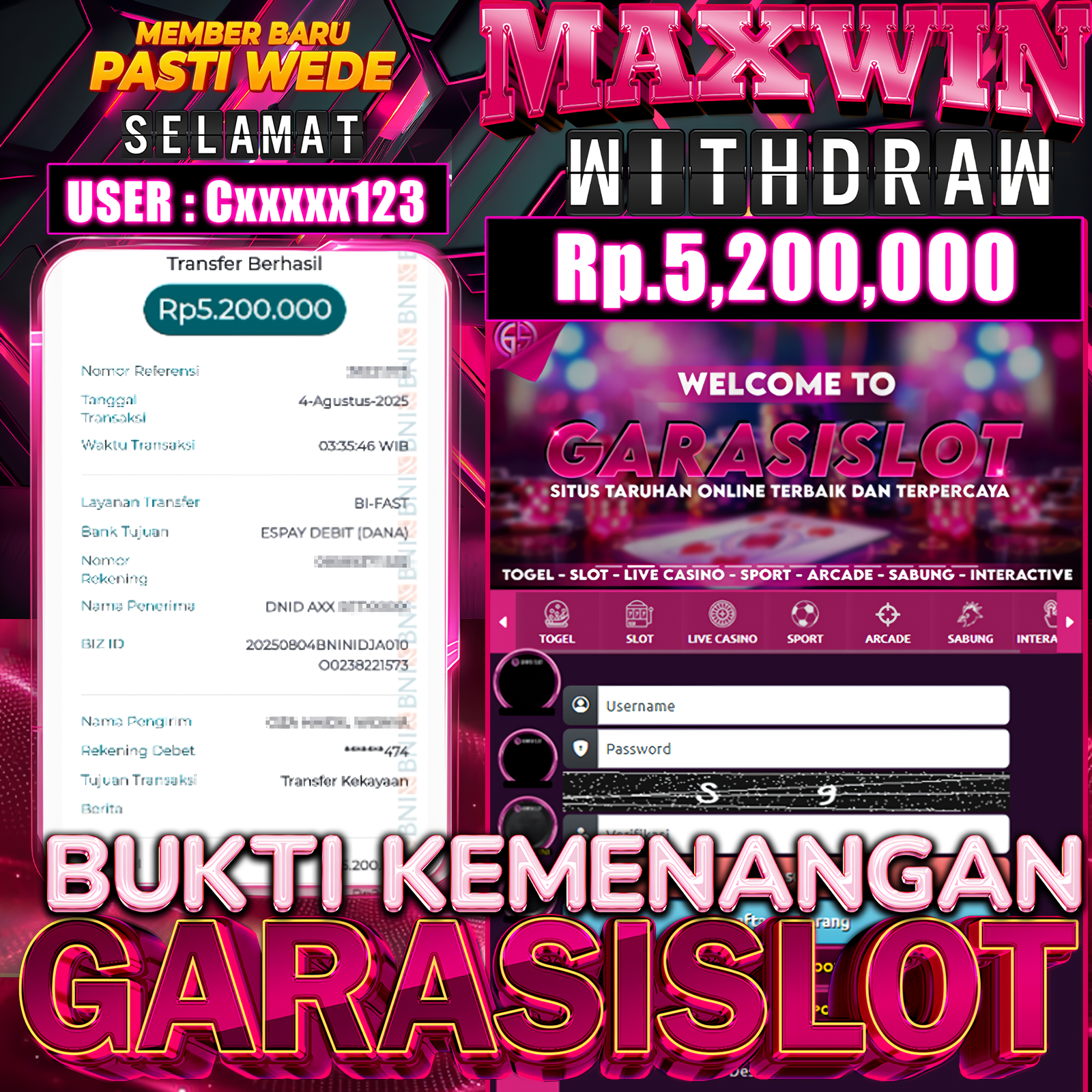 Selamat Kepada Id : Cxxxx123 Atas Withdraw Rp.5,200.000 Juta Hari ini. Ditunggu Withdraw Selanjutnya dan ajak juga teman temannya bergabung di GARASISLOT