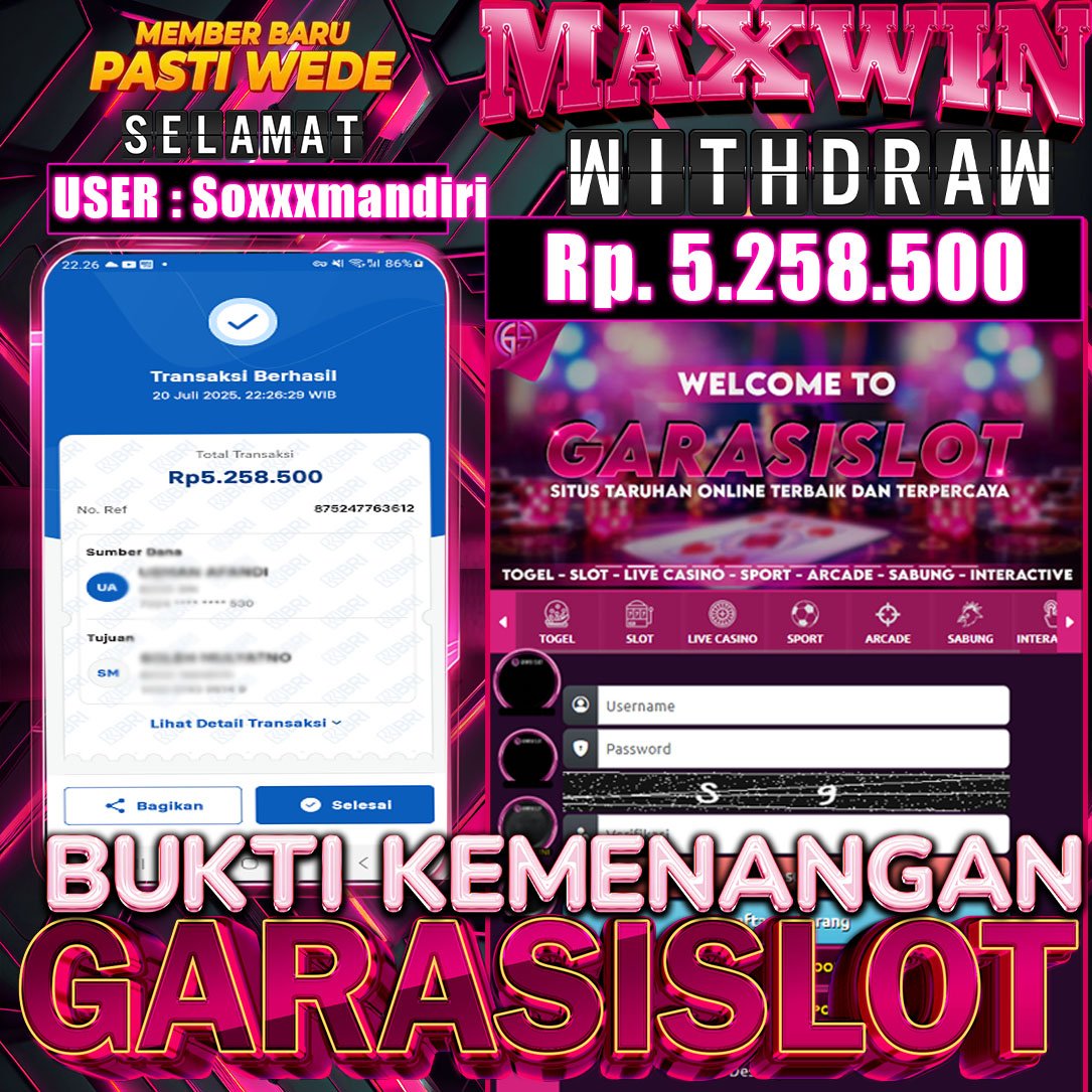 Selamat Kepada ID : soxxxmandiri Atas Withdraw Rp. 5.258,500 Juta Hari ini. Ditunggu Withdraw Selanjutnya dan ajak juga teman temannya bergabung di GARASISLOT Rumah ny seketer