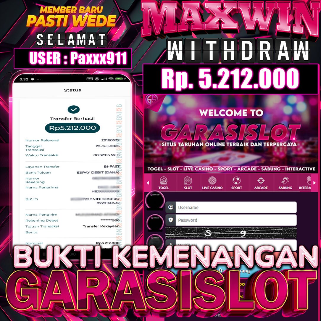 Selamat Kepada ID :paxxx911 Atas Withdraw Rp.5.212.000 Juta Hari ini. Ditunggu Withdraw Selanjutnya dan ajak juga teman temannya bergabung di GARASISLOT Rumah ny seketer